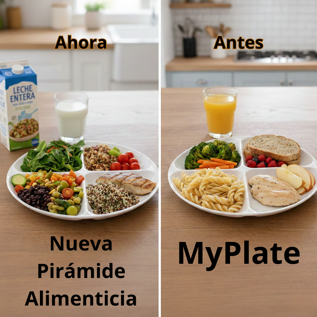 - Antes (MyPlate): Énfasis en lácteos descremados y granos refinados (arroz blanco, pasta blanca). El objetivo era simplemente “llenar” los grupos del plato con opciones bajas en grasa pero a menudo altas en carga glucémica.